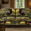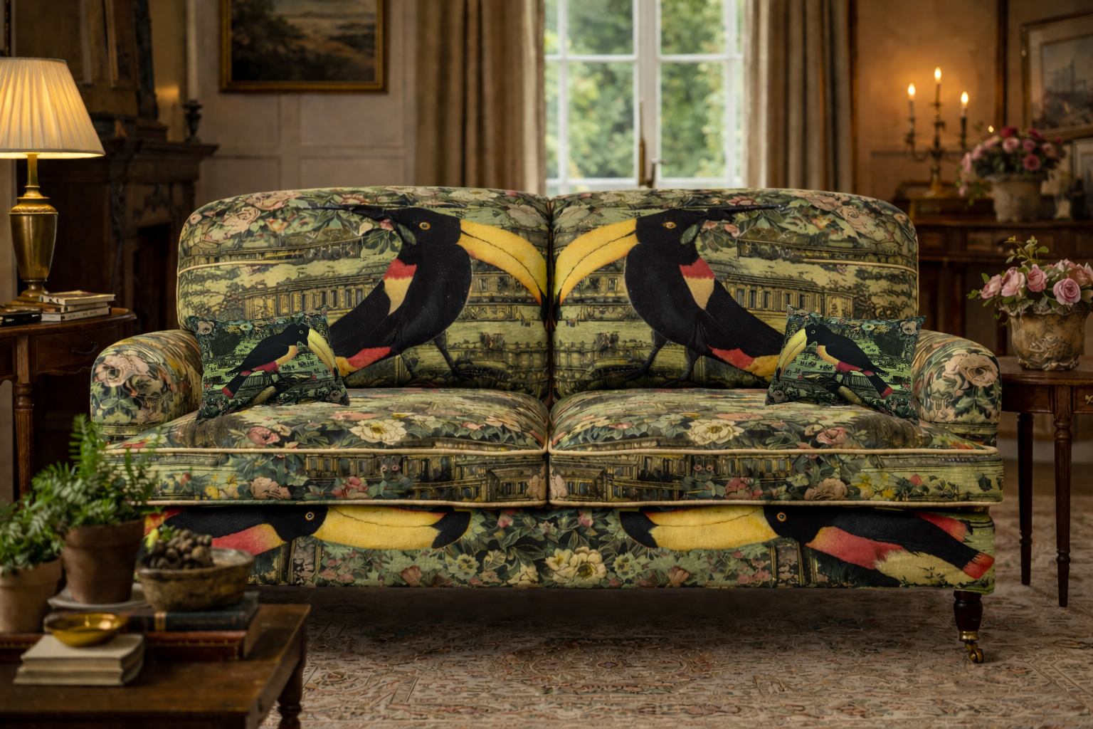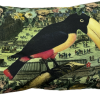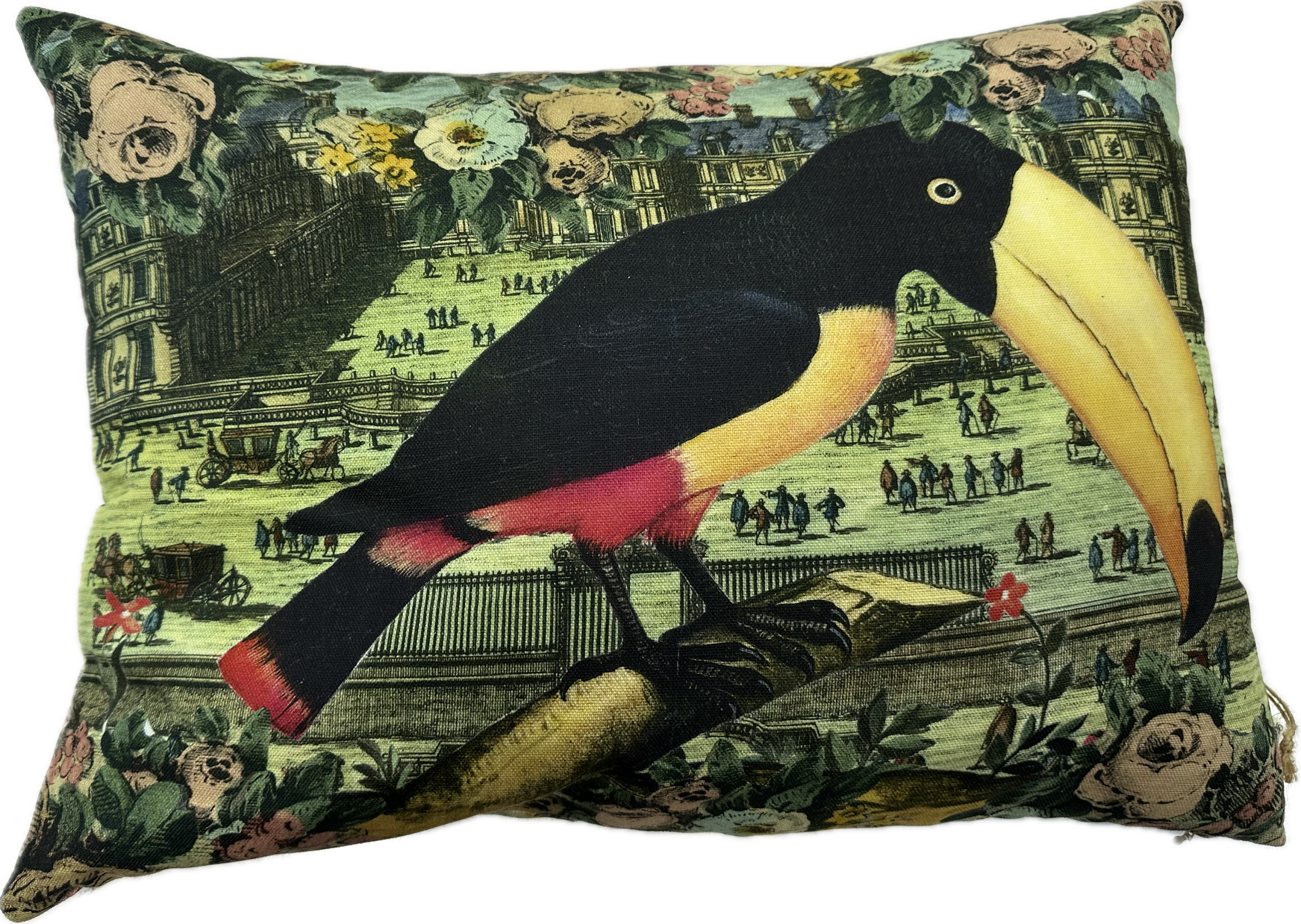 Un cuscino dal forte impatto visivo, ispirato alle illustrazioni naturalistiche d’epoca. Il protagonista, un elegante uccello esotico, si inserisce in uno scenario ricco di dettagli architettonici e botanici, creando una narrazione visiva sofisticata e colta.